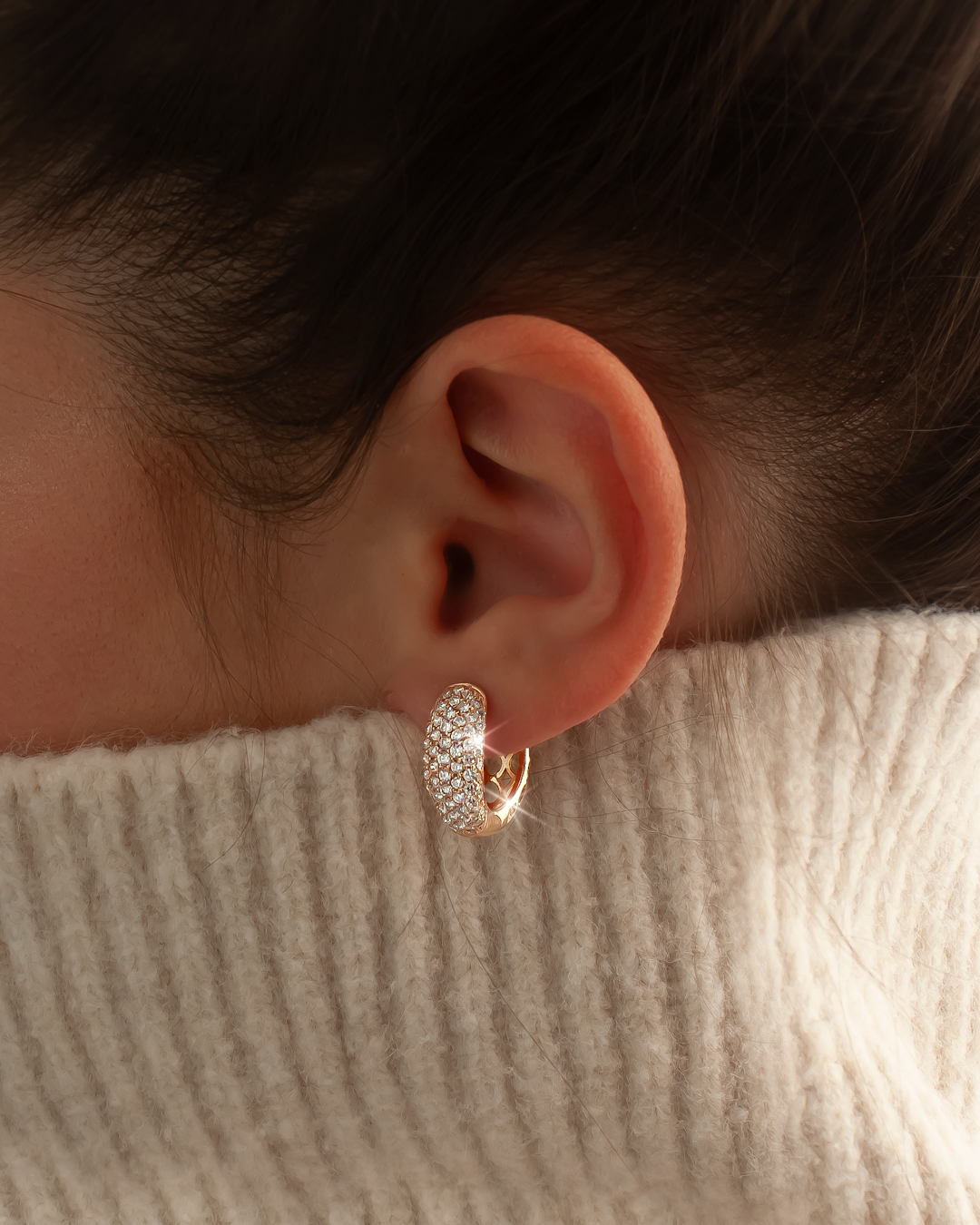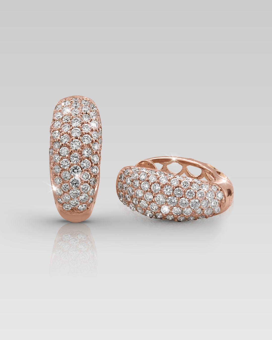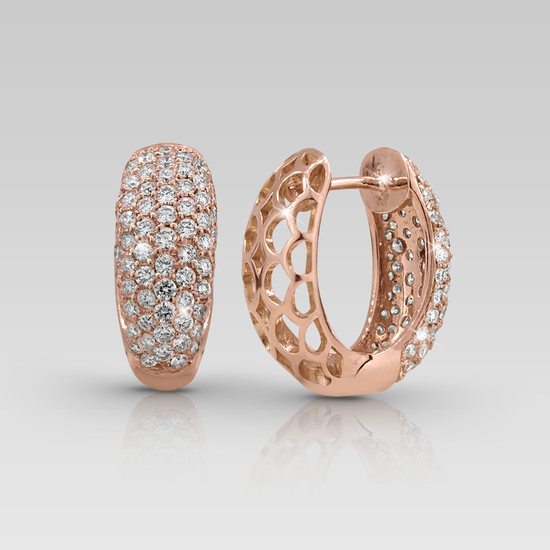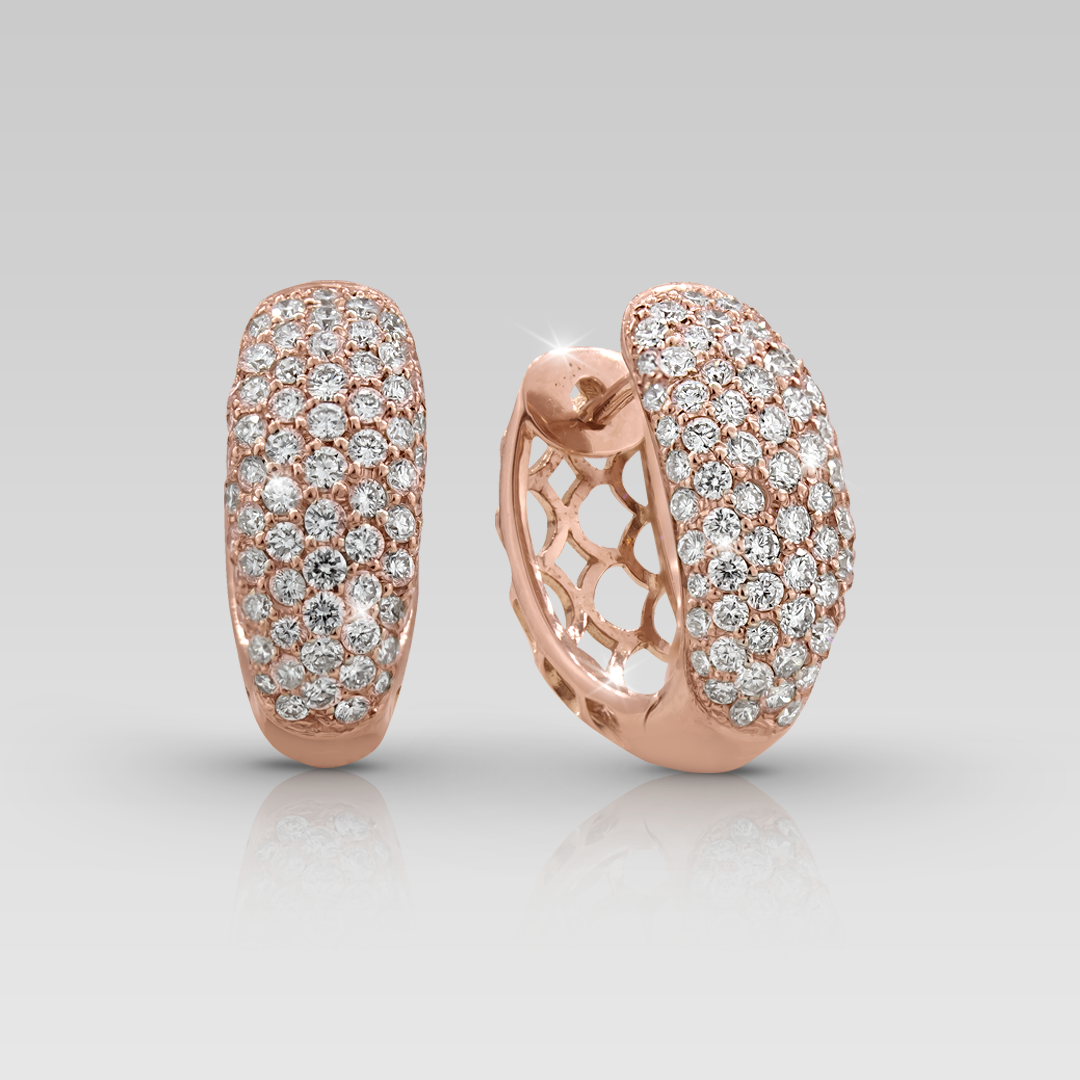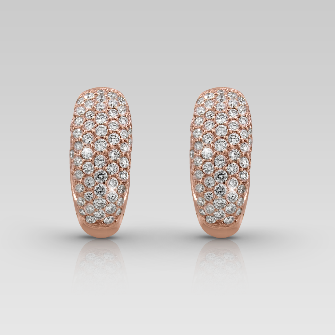 Zarcillos realizados en oro rosado 18K, con 142 brillantes naturales de diferentes tamaños, calibrados de corte round, color F y claridad VS.
