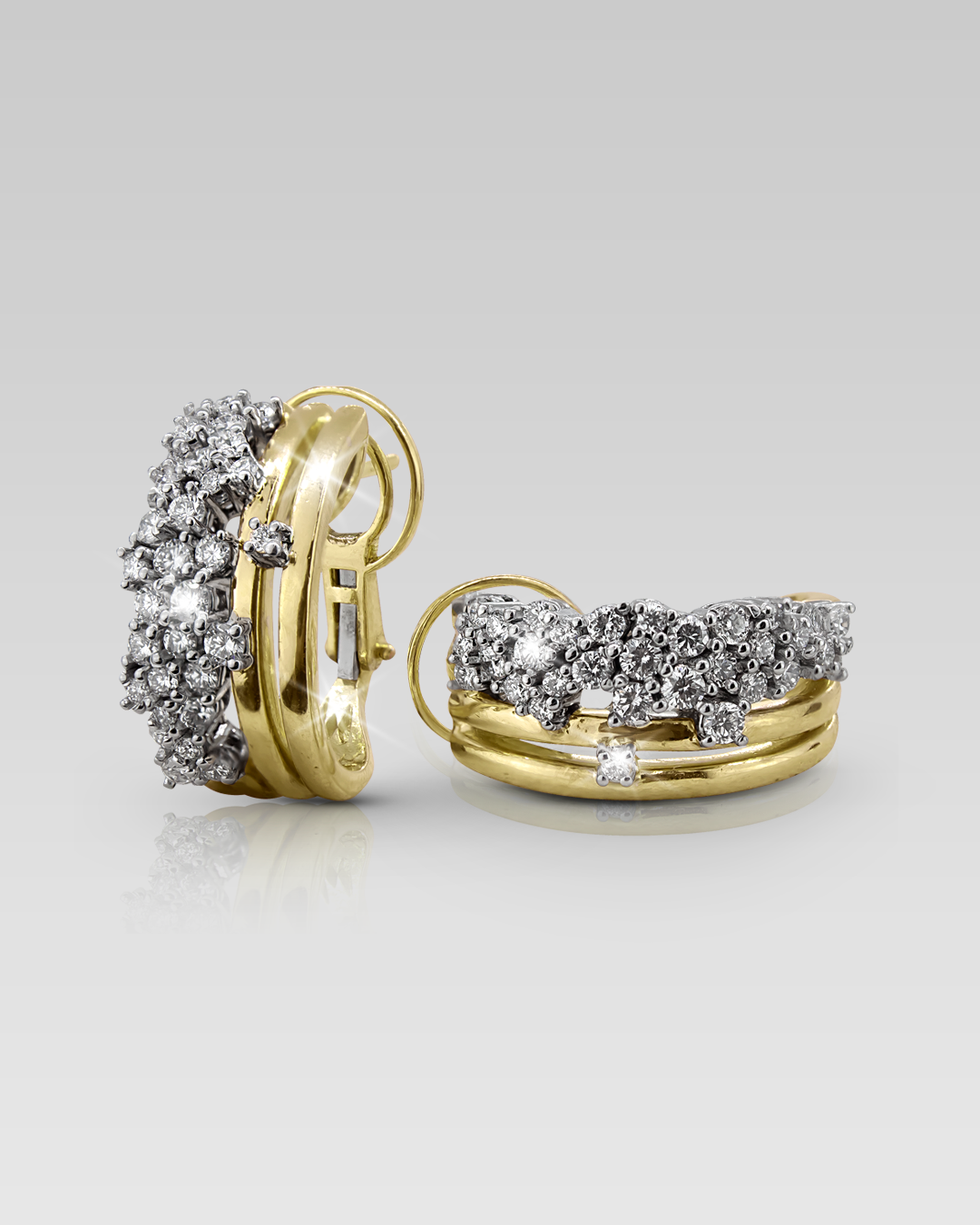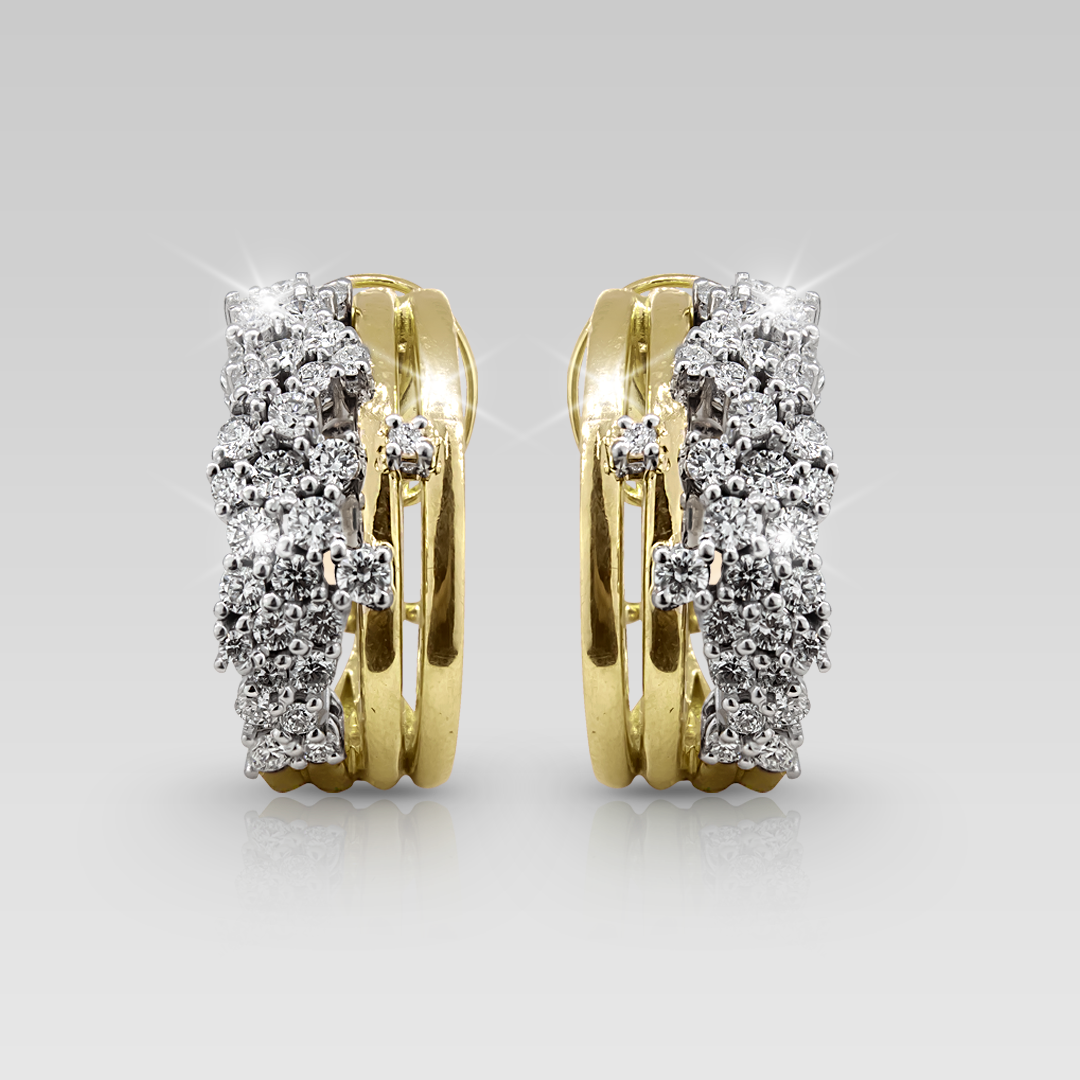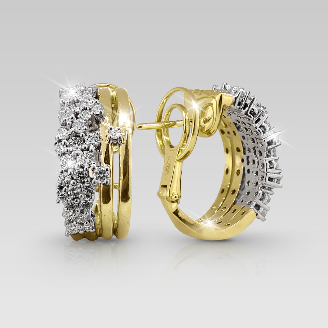 Zarcillos realizados en oro amarillo y oro blanco 18K, con 62 brillantes naturales de diferentes tamaños, corte round,color F, claridad VS.