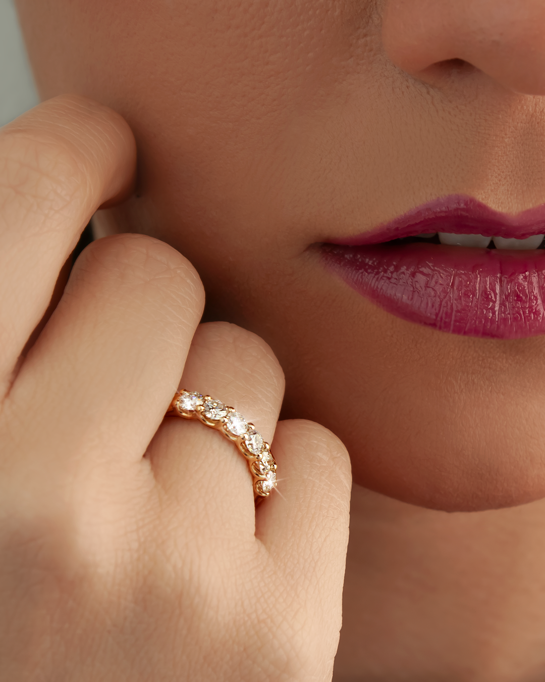 Anillo Cintillo Frida realizado en oro amarillo 18K, con 9 brillantes naturales de 2.20 mm, calibrados, corte round, color G/A, claridad VVS.