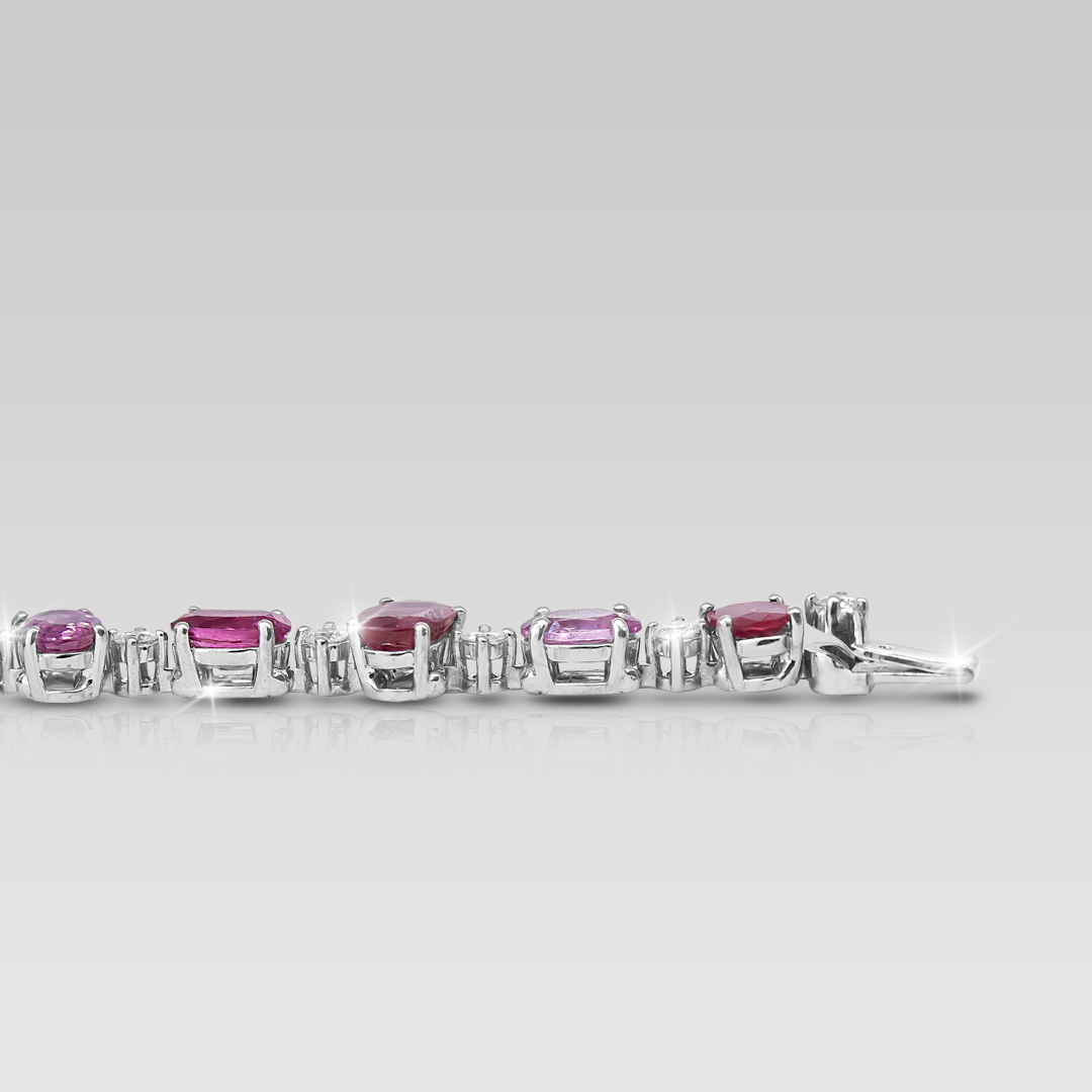Pulsera realizada en oro blanco 18K con 20 zafiros y rubíes naturales de 6x4mm en corte ovals en tonos rojos, vino y rosa intercalados acompañados de 20 brillantes de 2.10mm de corte round, color G, claridad VS.
