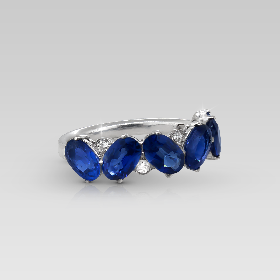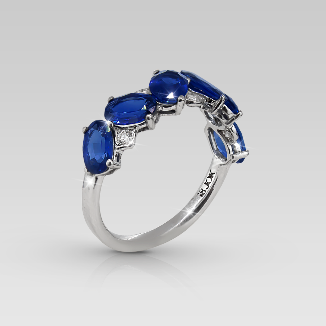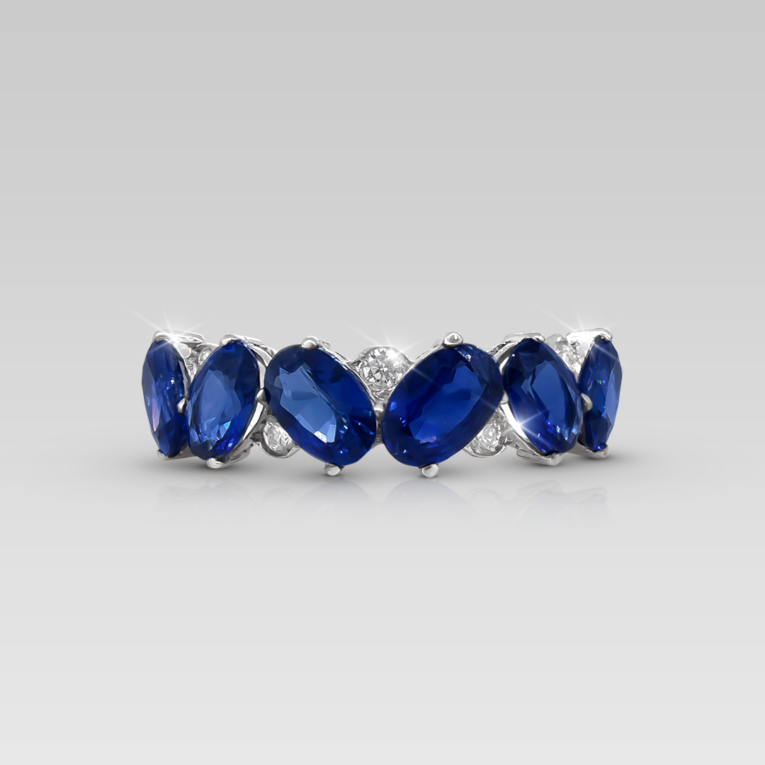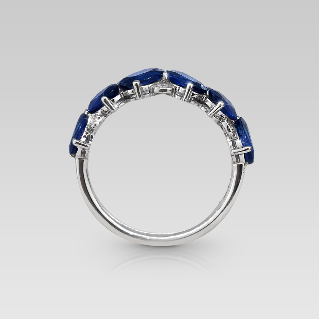 Anillo Ovals en oro blanco 18K, con 6 zafiros naturales de 6x4mm calibrados, color azul intenso acompañados por 5 brillantes naturales corte round, color F, claridad VS